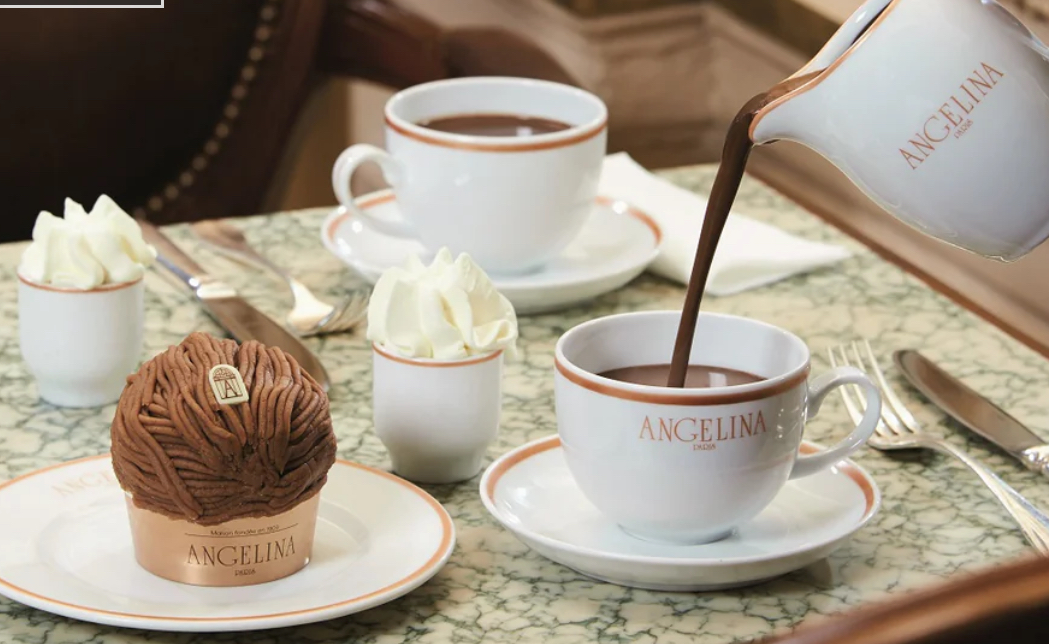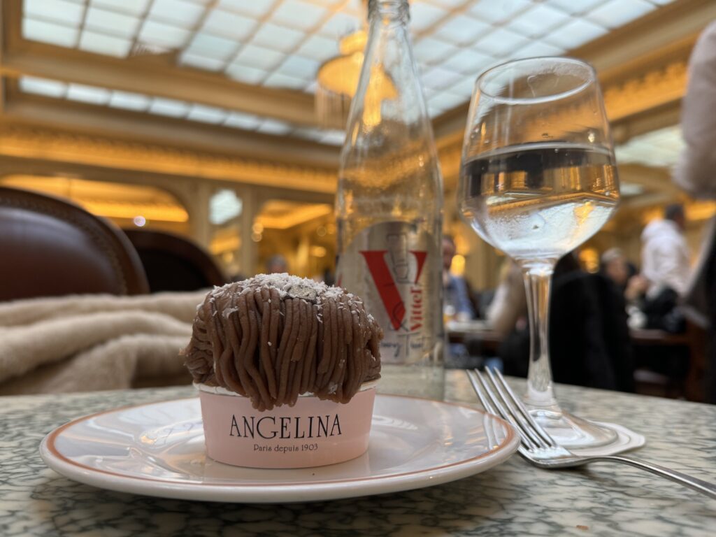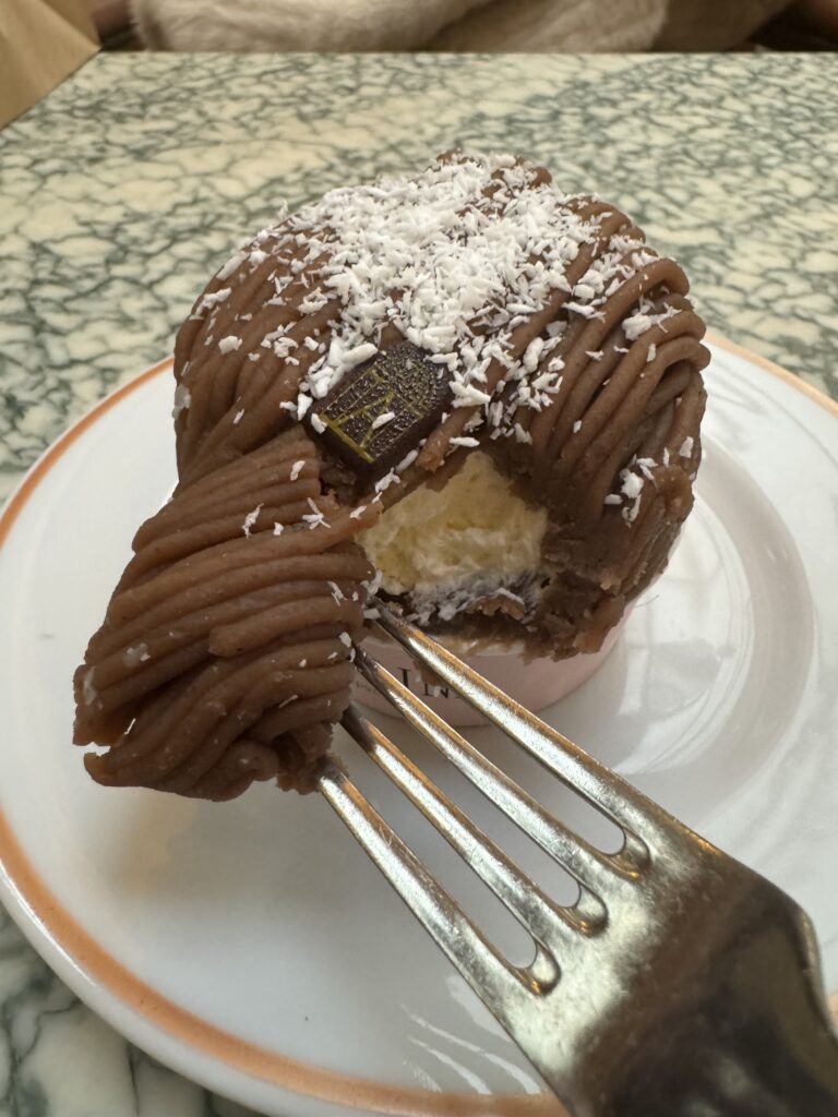 リヴォリ通りの老舗カフェ「アンジェリーナ」にふらり。ここはシャネルのお気に入りだったカフェ!濃厚なショコラ・ショー(ホットチョコ)と、山盛りマロンクリームのモンブランがお気に入りだったんだって!彼女のアトリエ、リッツパリからよくここに来てたそう。私も“シャネルごっこ”のつもりで、モンブランとショコラ・ショーをダブル注文。甘っ! !彼女は激甘党だったのね、クールなデザインとのギャップがいいね!次はどちらか1つだけにしておこうっと。